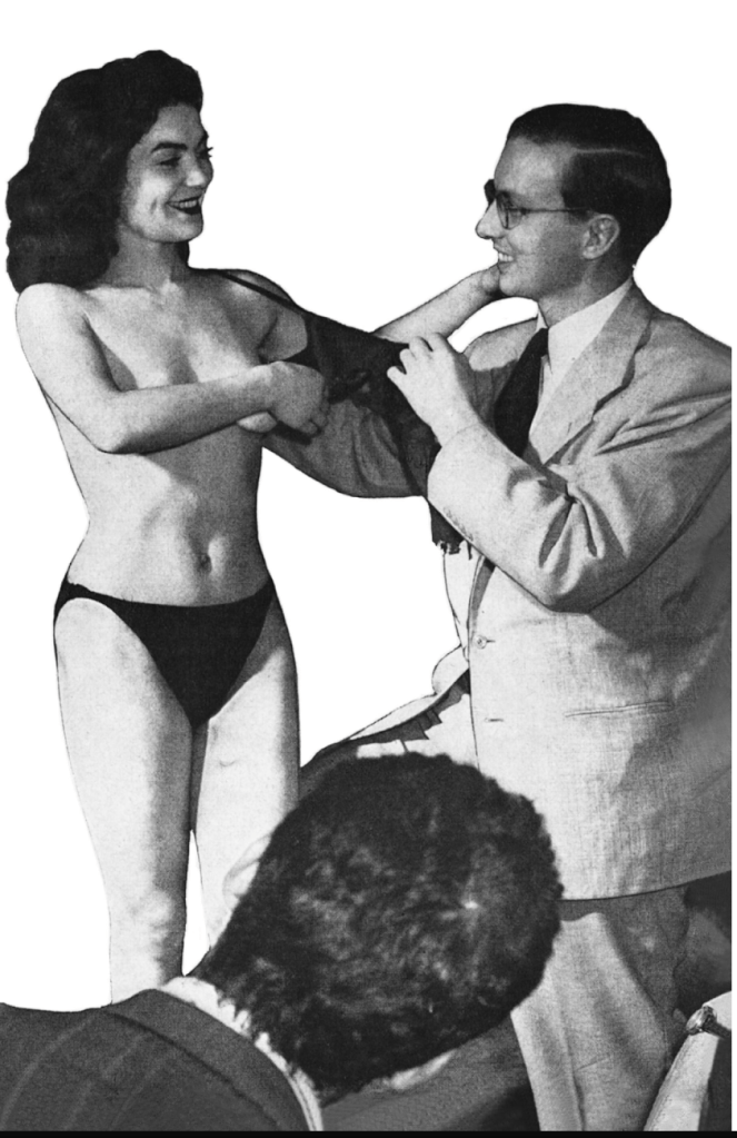 Image taken from Playboy December 1953 of two unnamed male models and a woman credited only as ‘Mademoiselle Genevieve’. While Hefner does advocate for gay rights and will go on to publish articles in the subject later on in the publication’s history, the decision to only publish women naked assumes the heterosexuality of the reader, enforcing that the Playboy as a concept is a straight male.