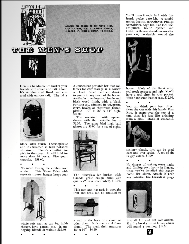 Consumer goods recommended by the magazine. The Playboy is an identity that can be brought. Aside from the gender bias, the marks of a Playboy are all linked to consumption. You can become intelligent by consuming culture and according to Hefner , you can access beautiful women by enticing them with the lifestyle that you market to them with the goods you have purchased.